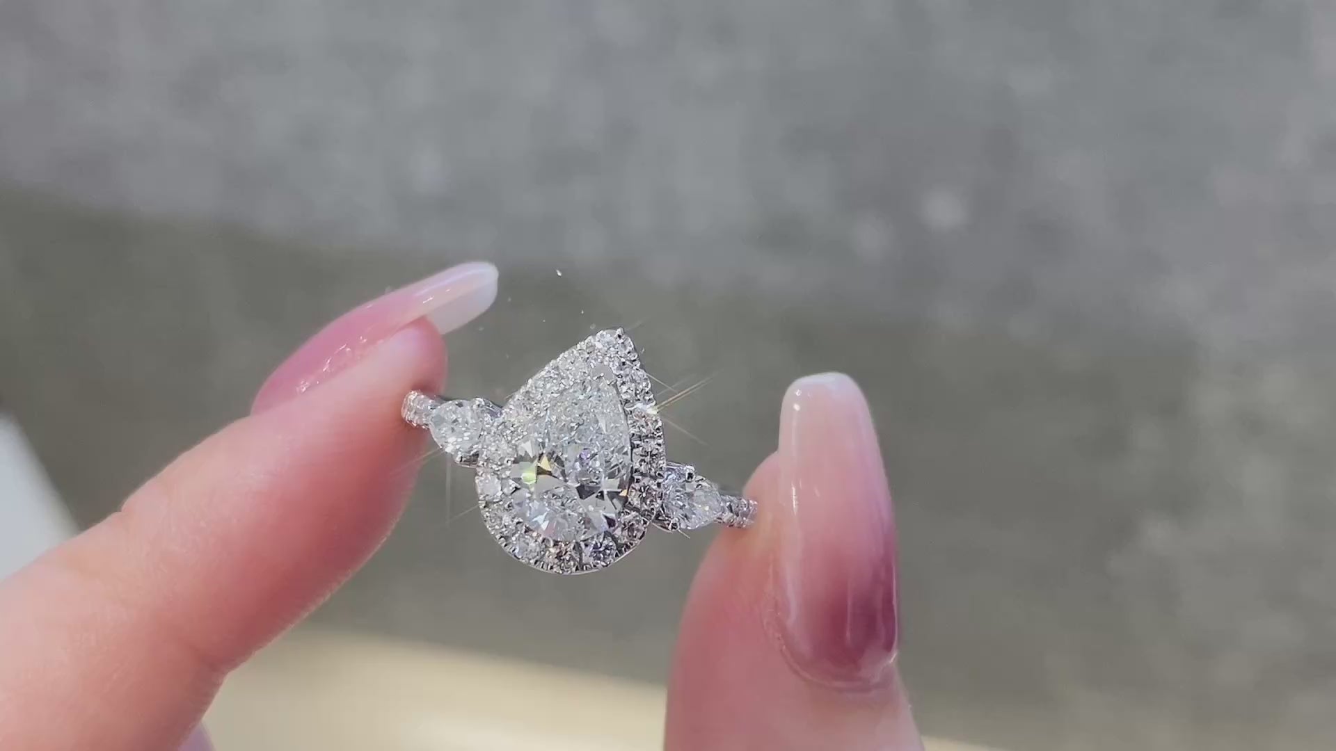 A cascading pear center stone, embraced by halo pavé bands, mimics starry vines entwining under an indigo sky—blending cosmic romance with botanical grace.