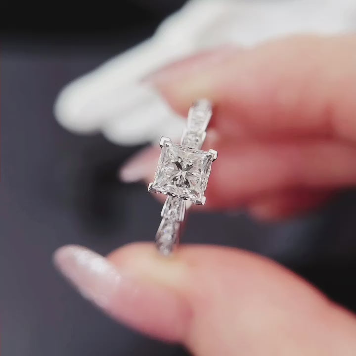 A stunning princess-cut diamond ring with a sleek band adorned with sparkling side stones. Its brilliant design captures light from every angle, making it a cherished heirloom.